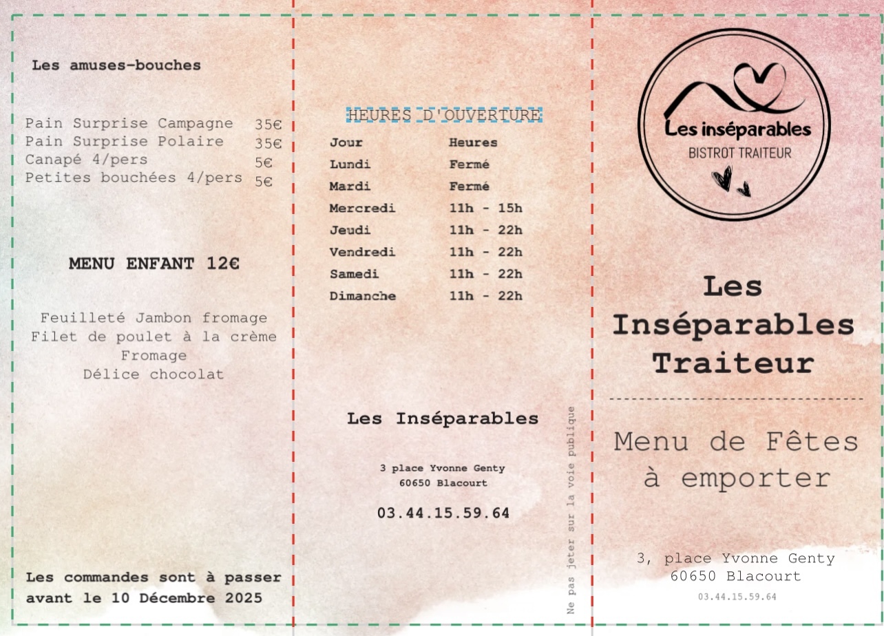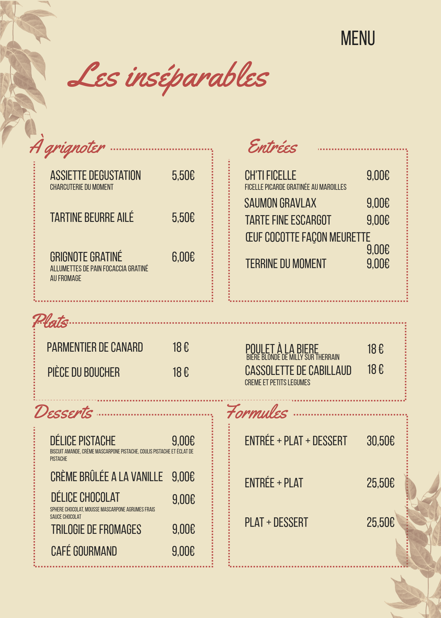 Bienvenue chez LES INSEPARABLES à BLACOURT ! Laissez-vous séduire par notre délicieuse sélection de cuisine française.